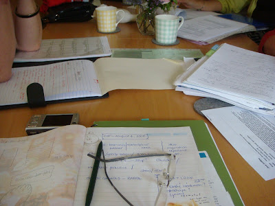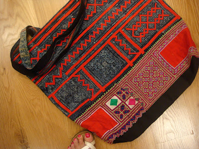 Whilst shopping in the night bazaar in Luang Prabang however, I had the benefit of a conversation with Mr Morn in the weaving workshop, had learned a little about the Hmong textile tradition from observation of the Hmong lady working on her batik and read up more in "Legends in the Weaving", a book I bought whilst there. So when I spotted these bags, I recognised the fabrics immediately and knew they had been made from Blue Hmong clothing. What treasure! (My foot is in the picture above so you can get an idea of size and scale)