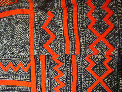 The scarlet cotton applique has been applied by hand with absolute geometric precision. Mitred corners are beautifully neat and there is little or no bulk. Traditionally the base fabric would have been hemp (as the Hmong woman in the workshop was using) but I am not sure that the fabric of my bags is coarse enough to be hemp. I don't know.