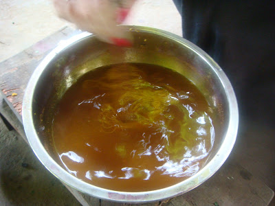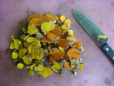 First task, chopping tumeric for the yellow colour. That had to be pounded to a pulp before boiling with sappan leaves to achieve the colour I wanted.