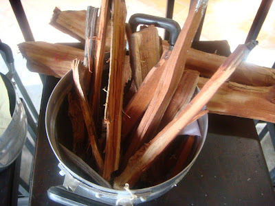 The sappan wood liquor had been fermenting for several days and was at a steady boil at my side ready to accept the skein of silk which I'd soaked with a huge alum crystal in the water to give the gorgeous rich purple colour.