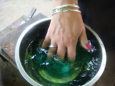 Whilst that was cooking, I chopped some fresh indigo leaves and soaked them in cold water for the green dye.